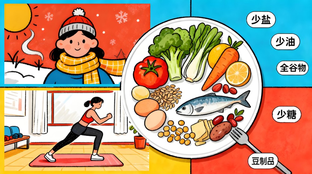 在飲食方面,要堅持膳食均衡,遵循少鹽、少油、少糖原則,多攝入新鮮的蔬菜、水果、全谷物、優(yōu)質(zhì)蛋白質(zhì)(如魚類、瘦肉、豆制品等)。