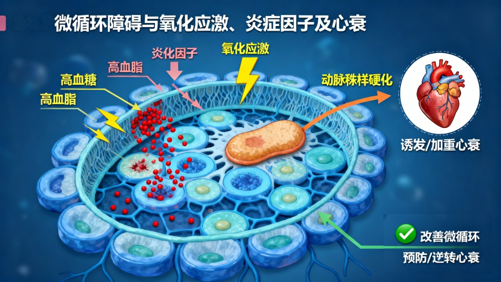 微循環(huán)障礙是心衰進(jìn)展的核心機(jī)制之一。當(dāng)心臟功能下降時,微血管網(wǎng)絡(luò)因血流減少、血管內(nèi)皮損傷而功能失調(diào),導(dǎo)致組織缺氧和代謝廢物堆積。這會進(jìn)一步削弱心肌收縮力,形成“心衰—微循環(huán)障礙—心衰加重”的惡性循環(huán)。功能醫(yī)學(xué)研究發(fā)現(xiàn),微循環(huán)障礙還與氧化應(yīng)激和炎癥因子釋放密切相關(guān),例如,高血糖或高血脂環(huán)境會加劇血管內(nèi)皮損傷,促進(jìn)動脈粥樣硬化,最終誘發(fā)或加重心衰。因此,改善微循環(huán)成為預(yù)防和逆轉(zhuǎn)心衰的關(guān)鍵靶點(diǎn)。