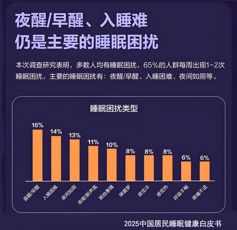 《2025中國居民睡眠健康白皮書》顯示:我國居民整體睡眠狀況不容樂觀,超過65%的受訪者長期存在睡眠困擾,夜間睡眠時(shí)長普遍偏短,總體睡眠質(zhì)量欠佳。
