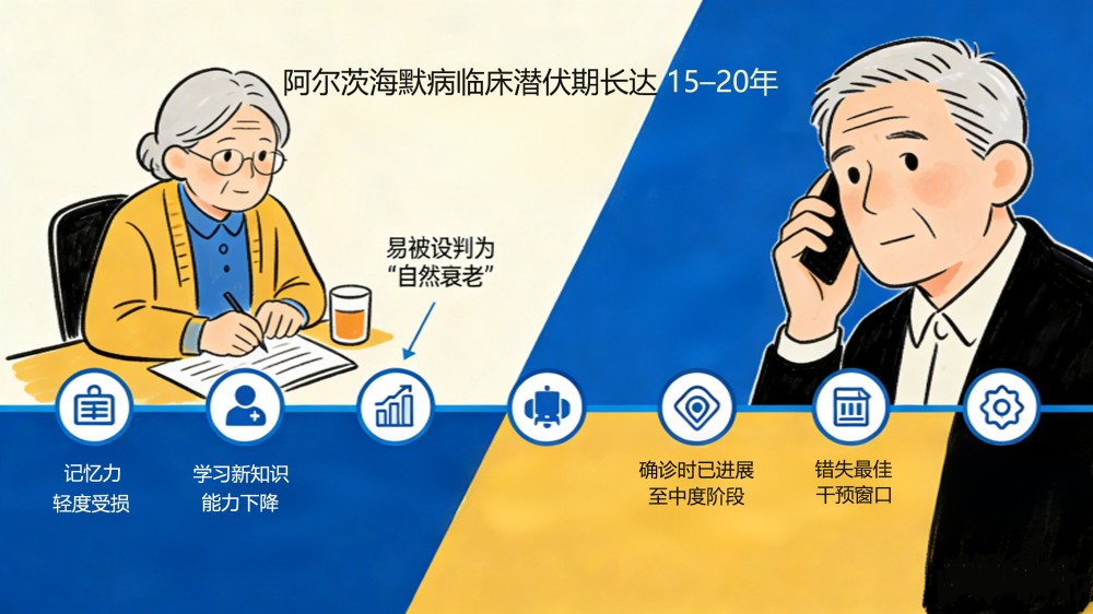 阿爾茨海默病作為全球高發(fā)的神經(jīng)系統(tǒng)退行性疾病,已成為我國重大公共衛(wèi)生與民生挑戰(zhàn)。權(quán)威數(shù)據(jù)顯示,我國60歲及以上人群癡呆患者約2000萬,其中阿爾茨海默病占比60%–70%;60歲以上人群輕度認知障礙患病率達15.5%,對應(yīng)患者超3887萬。該病臨床潛伏期長達15–20年,早期僅表現(xiàn)為記憶力輕度受損、學(xué)習(xí)新知識能力下降等癥狀,易被誤判為“自然衰老”,近半數(shù)患者確診時已進展至中度階段,錯失最佳干預(yù)窗口。