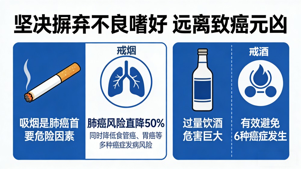 第一,堅(jiān)決摒棄不良嗜好,遠(yuǎn)離致癌元兇。吸煙是導(dǎo)致肺癌的首要危險(xiǎn)因素,戒煙可使肺癌風(fēng)險(xiǎn)直降50%,同時(shí)還能降低食管癌、胃癌等多種癌癥的發(fā)病風(fēng)險(xiǎn);過量飲酒同樣危害巨大,限酒甚至戒酒,能有效避免6種癌癥的發(fā)生,減少酒精對身體器官的持續(xù)性損傷,守護(hù)身體的健康屏障。