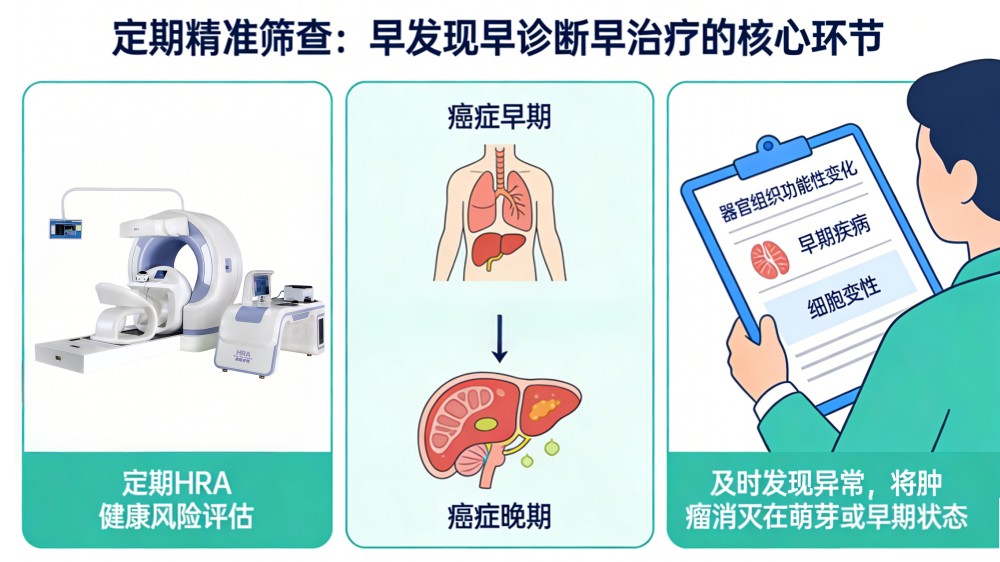 除了養(yǎng)成健康的生活習(xí)慣,重視定期精準(zhǔn)篩查,更是實(shí)現(xiàn)“早發(fā)現(xiàn)、早診斷、早治療”的核心環(huán)節(jié),也是癌癥防控中不可或缺的重要一步。很多癌癥在早期并沒有明顯的癥狀,一旦出現(xiàn)不適癥狀,往往已經(jīng)發(fā)展到中晚期,治療難度大幅增加,治療效果也會(huì)大打折扣。定期進(jìn)行HRA健康風(fēng)險(xiǎn)評(píng)估,不僅能及時(shí)發(fā)現(xiàn)身體器官組織的功能性變化,篩查早期疾病,而且能及時(shí)發(fā)現(xiàn)機(jī)體是否存在細(xì)胞變性,從而幫助將腫瘤消滅在萌芽或早期狀態(tài)。