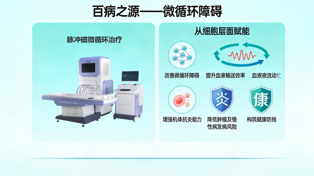 最后,注重微循環(huán)修復(fù),是提升機(jī)體防癌能力、降低癌癥風(fēng)險(xiǎn)的重要手段。“百病之源——微循環(huán)障礙”,當(dāng)人體微循環(huán)出現(xiàn)障礙時(shí),血液輸送氧氣和營養(yǎng)物質(zhì)的能力會(huì)下降,機(jī)體代謝廢物無法及時(shí)排出,免疫力會(huì)隨之降低,炎癥反應(yīng)加劇,不僅會(huì)增加肥胖、高血壓、高血糖等慢性病的發(fā)病風(fēng)險(xiǎn),還會(huì)為癌細(xì)胞的生長繁殖提供“溫床”。而脈沖磁微循環(huán)治療,能從細(xì)胞層面為身體賦能,有效改善微循環(huán)障礙,提升血液輸送氧氣和營養(yǎng)物質(zhì)的效率,增強(qiáng)機(jī)體抵抗炎癥的能力,從而降低腫瘤及各類慢性病的發(fā)病風(fēng)險(xiǎn),為身體構(gòu)筑起健康防線。