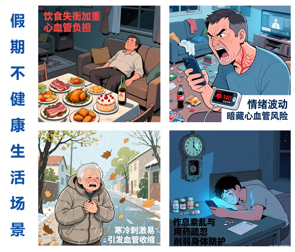 復盤假期生活,諸多細節(jié)都在悄悄透支心血管健康。其一,飲食失衡是主要誘因,高鹽、高脂、高糖食物加上飲酒過量,會加重心血管負擔,誘發(fā)血管收縮、血壓波動;其二,情緒波動暗藏風險,易引發(fā)心率加快、血壓驟升,增加心血管急癥發(fā)作概率;其三,寒冷刺激雪上加霜,冬春交替之際氣溫多變,冷空氣會直接導致血管收縮,影響血液循環(huán),尤其對本身有心血管基礎疾病的人群更為不利;其四,作息紊亂與用藥疏忽,假期熬夜娛樂、作息顛倒,加上部分慢性病患者擅自停藥、漏服,進一步削弱了身體的防護能力,讓心血管疾病有機可乘。