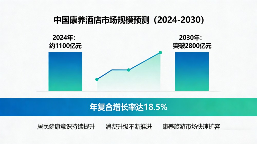 市場(chǎng)的熱度與數(shù)據(jù),印證著康養(yǎng)酒店的巨大發(fā)展?jié)摿?。?jù)行業(yè)測(cè)算,2024年中國(guó)康養(yǎng)酒店市場(chǎng)規(guī)模約1100億元,隨著居民健康意識(shí)的持續(xù)提升、消費(fèi)升級(jí)的不斷推進(jìn),以及康養(yǎng)旅游市場(chǎng)的快速擴(kuò)容,這一數(shù)字仍在穩(wěn)步攀升,預(yù)計(jì)到2030年市場(chǎng)規(guī)模將突破2800億元,年復(fù)合增長(zhǎng)率達(dá)18.5%。這一增速遠(yuǎn)超傳統(tǒng)酒店行業(yè)平均水平,也折射出當(dāng)下人們對(duì)“健康+度假”融合模式的強(qiáng)烈需求,康養(yǎng)酒店正從行業(yè)藍(lán)海逐漸成長(zhǎng)為文旅康養(yǎng)產(chǎn)業(yè)的核心增長(zhǎng)極,吸引著資本與市場(chǎng)的雙重關(guān)注。