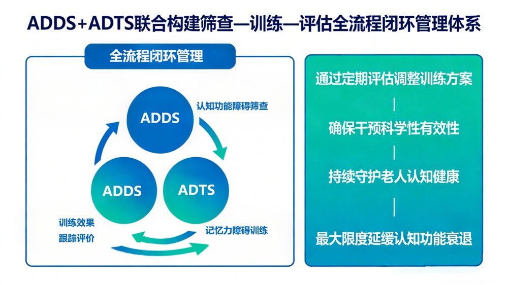 守護(hù)老人認(rèn)知健康,并非單一的篩查或訓(xùn)練就能實(shí)現(xiàn),完善的閉環(huán)管理才是關(guān)鍵。“ADDS+ADTS”聯(lián)合構(gòu)建“篩查—訓(xùn)練—評(píng)估”全流程閉環(huán)管理體系,從ADDS認(rèn)知功能篩查精準(zhǔn)識(shí)別風(fēng)險(xiǎn),到ADTS記憶力障礙訓(xùn)練針對(duì)性干預(yù),再到定期專(zhuān)業(yè)評(píng)估跟蹤康復(fù)效果,形成一套完整的健康管理鏈條。通過(guò)定期評(píng)估,及時(shí)調(diào)整訓(xùn)練方案,確保干預(yù)的科學(xué)性和有效性,持續(xù)守護(hù)老人的認(rèn)知健康,最大限度延緩認(rèn)知功能衰退,讓老人能夠保持尊嚴(yán)、快樂(lè)安享晚年。