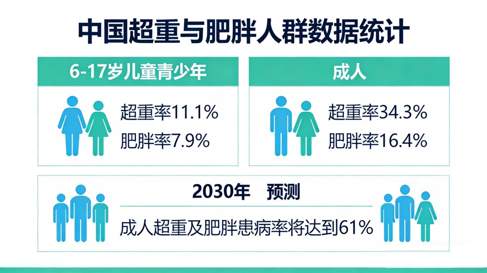 我國超重與肥胖人群的發(fā)病率、增長速度均居世界首位。最新全國統(tǒng)計數(shù)據(jù)顯示:6-17歲兒童青少年:超重率11.1%、肥胖率7.9%;成人:超重率34.3%、肥胖率16.4%;預(yù)計到2030年,中國成人超重及肥胖患病率將達到61%。