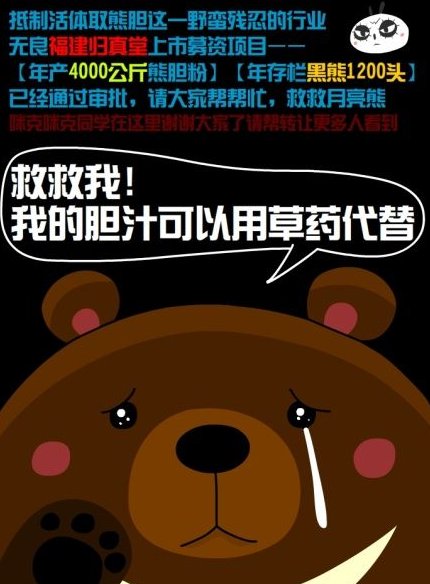 網(wǎng)友“低碳地球”發(fā)起了“萬(wàn)人簽名征集”活動(dòng),呼吁抵制歸真堂上市。他說(shuō),現(xiàn)代醫(yī)學(xué)證明,熊膽功效被過(guò)分夸大,并非無(wú)可替代的“神藥”?;钚苋∧懯菬o(wú)意義的殘忍。