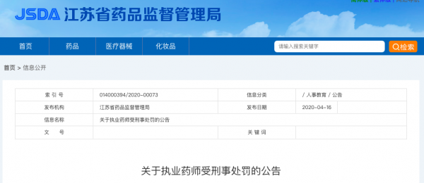 近日,江蘇省藥監(jiān)局發(fā)布了《關(guān)于執(zhí)業(yè)藥師受刑事處罰的公告》。