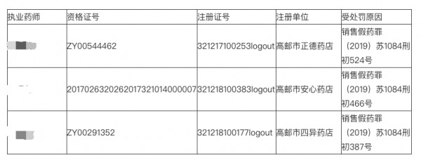 公告顯示,3名執(zhí)業(yè)藥師因銷售假藥罪受刑事處罰。目前,當?shù)刈詸C構(gòu)已按規(guī)定注銷其注冊證書,省局已將其刑事處罰信息錄入全國執(zhí)業(yè)藥師注冊系統(tǒng)“獎懲記錄欄”。
