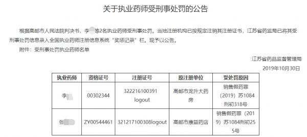 這并非個例。早在去年10月底,江蘇藥監(jiān)局也通報了類似的刑事處罰的公告,2名執(zhí)業(yè)藥師受刑事處罰。