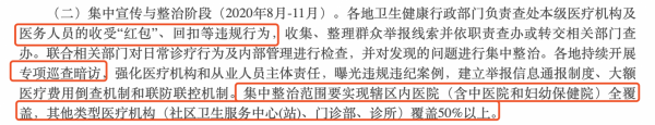 進(jìn)入到8月份,就正式進(jìn)入集中宣傳與整治階段。各地衛(wèi)生健康行政部門負(fù)責(zé)查處本級醫(yī)療機(jī)構(gòu)及醫(yī)務(wù)人員的收受“紅包”、回扣等違規(guī)行為,收集、整理群眾舉報線索并依職責(zé)查辦或轉(zhuǎn)交相關(guān)部門查辦。