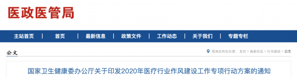 日前,國家衛(wèi)健委發(fā)布了《2020年醫(yī)療行業(yè)作風(fēng)建設(shè)工作專項行動方案》,這次方案的重點(diǎn)就是規(guī)范醫(yī)療機(jī)構(gòu)及其從業(yè)人員行為,印發(fā)給各省、自治區(qū)、直轄市及新疆生產(chǎn)建設(shè)兵團(tuán)衛(wèi)生健康委,開始組織實(shí)施。