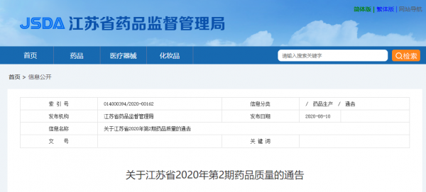8月10日,江蘇省藥監(jiān)局發(fā)布了“2020年第2期藥品質量的通告”(以下簡稱“通告”)。