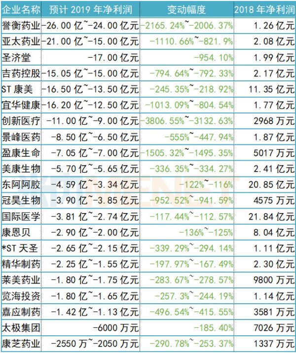 預(yù)計(jì)2019年凈利潤(rùn)首虧的A股醫(yī)藥企業(yè)
