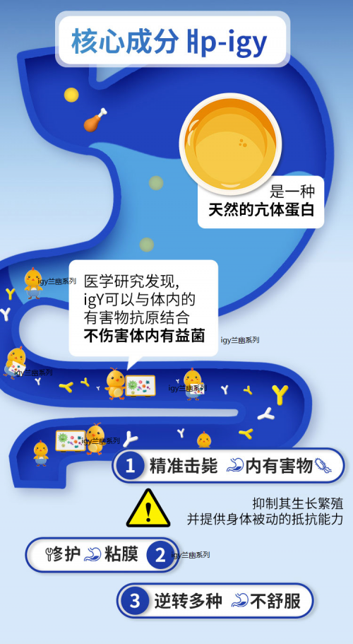 除了傳統(tǒng)的抗生素四聯(lián)療法外,近年來出現(xiàn)了一種創(chuàng)新的治療方式——口服抗體iGY療法。在這種治療方法中,iGY代表著免疫球蛋白Y,它是從雞蛋中提取的天然抗體。iGY抗體能夠與幽門螺桿菌特異性結合,將其靶向清除,從而達到治療的效果。相比傳統(tǒng)的抗生素治療,iGY療法更為溫和、無副作用,并且不會導致耐藥性產(chǎn)生,為患者提供了一種更加安全有效的選擇。