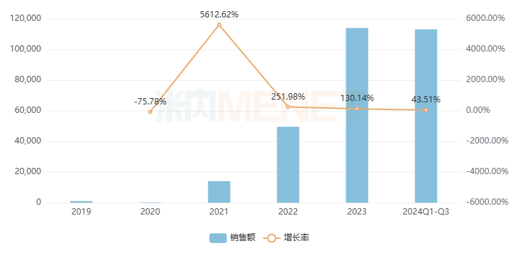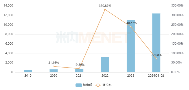 益佰制藥的獨家產(chǎn)品疏肝益陽膠囊用于治療肝郁腎虛和肝郁腎虛兼血瘀證所致功能性陽痿和輕度動脈供血不足性陽痿等癥,該產(chǎn)品近幾年在中國網(wǎng)上藥店終端的銷售額保持高速增長態(tài)勢,2023年突破1億元,2024年Q1-Q3再有超過70%的增長。