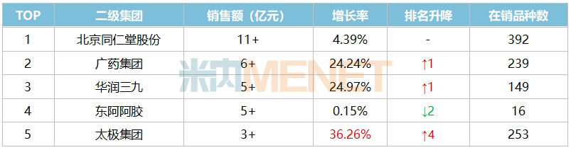 2024年Q1-Q3中成藥TOP5集團大洗牌,廣藥集團和華潤三九銷售額增長率均超過20%,排名各上升1位,而太極集團則大漲36.26%,排名一口氣躍升了4位。