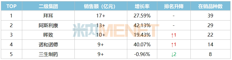 4家跨國藥企繼續(xù)牢牢守住領(lǐng)先地位,拜耳以17.5億元的銷售額穩(wěn)坐TOP1集團寶座,暉致、諾和諾德各上升1位,而本土企業(yè)三生制藥排在TOP5。