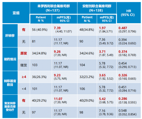預(yù)先設(shè)定的PFS亞組分析顯示,不同亞組患者的結(jié)果與整體研究結(jié)果一致,包括年齡(<65歲或>65歲)、是否絕經(jīng)、激素受體狀態(tài)、既往內(nèi)分泌治療耐藥情況、既往內(nèi)分泌治療目的、既往復(fù)發(fā)/轉(zhuǎn)移期是否接受過化療、是否內(nèi)臟轉(zhuǎn)移、是否肝轉(zhuǎn)移是否存在可測量病灶、以及基線美國東部腫瘤協(xié)作組(ECOG)體能狀態(tài)等。在亞組分析中,來羅西利組在肝轉(zhuǎn)移、原發(fā)耐藥、轉(zhuǎn)移器官數(shù)目≥4(高腫瘤負(fù)荷)以及既往接受過化療等高危難治人群中同樣表現(xiàn)出色。
