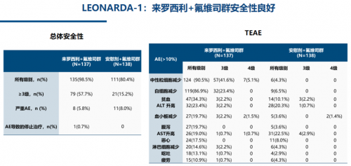 安全性方面,來羅西利組≥3級不良事件發(fā)生率為57.7%, 4級中性粒細(xì)胞減少比例僅為5.1%,腹瀉發(fā)生率為19.7%,無3級及以上腹瀉發(fā)生。此外,來羅西利組較安慰劑組未增加肝毒性、Q-T間期延長、皮疹、靜脈血栓等發(fā)生風(fēng)險(xiǎn);AE導(dǎo)致的停止治療僅為0.7%,安全性更高。