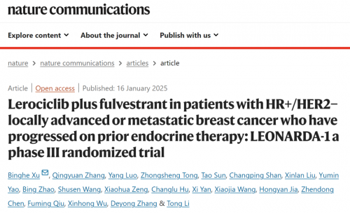 4、Xu, Binghe et al. “Lerociclib plus fulvestrant in patients with HR+/HER2- locally advanced or metastatic breast cancer who have progressed on prior endocrine therapy: LEONARDA-1 a phase III randomized trial.” Nature communications vol. 16,1 716. 16 Jan. 2025, doi:10.1038/s41467-025-56096-2