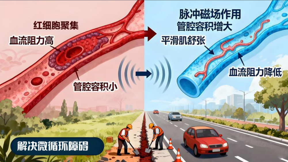 擴(kuò)張微血管,打通“血液循環(huán)末梢”:脈沖磁場(chǎng)可精準(zhǔn)作用于外周微血管(如毛細(xì)血管、微動(dòng)脈、微靜脈),調(diào)節(jié)血管平滑肌舒張狀態(tài),增加微血管管腔容積、降低血流阻力。這就像為“堵塞的小路”拓寬通道,讓血液順暢流經(jīng)組織間隙,解決微循環(huán)障礙導(dǎo)致的“供血不足”問(wèn)題。