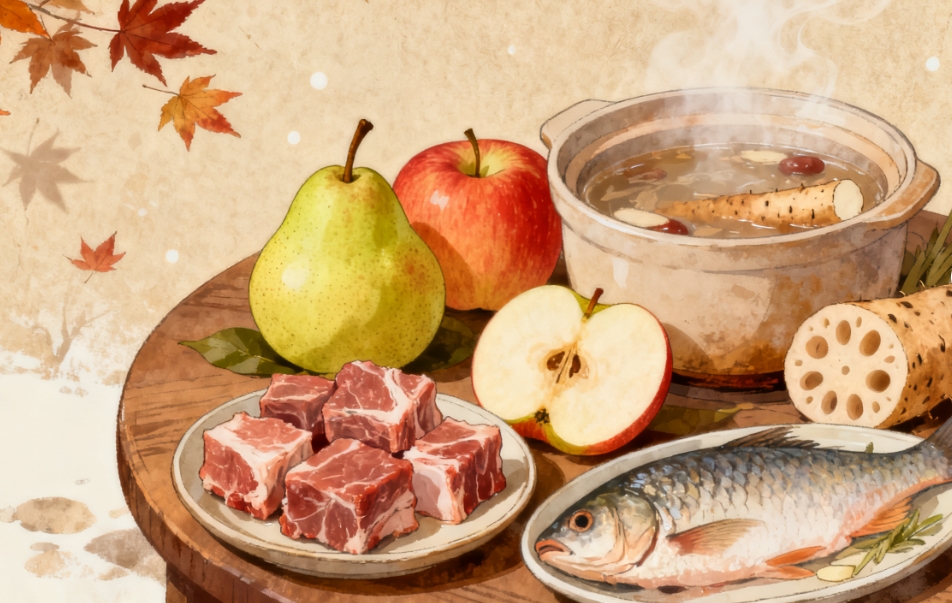 霜降是秋天的尾巴,每到這個(gè)時(shí)候,我們往往會(huì)感到更加干燥,很多人會(huì)出現(xiàn)口干、唇干、鼻干、咽干、皮膚干燥、大便干結(jié)等問(wèn)題。這些都是因?yàn)樵镄昂膫蛞簩?dǎo)致的,所以建議以溫潤(rùn)食材為主,兼顧防燥與御寒,如梨、蘋果、山藥、蓮藕等潤(rùn)燥蔬果,搭配羊肉、魚肉等優(yōu)質(zhì)蛋白。減少寒性食物(如西瓜、苦瓜)和辛辣刺激物攝入,以防損傷脾胃。