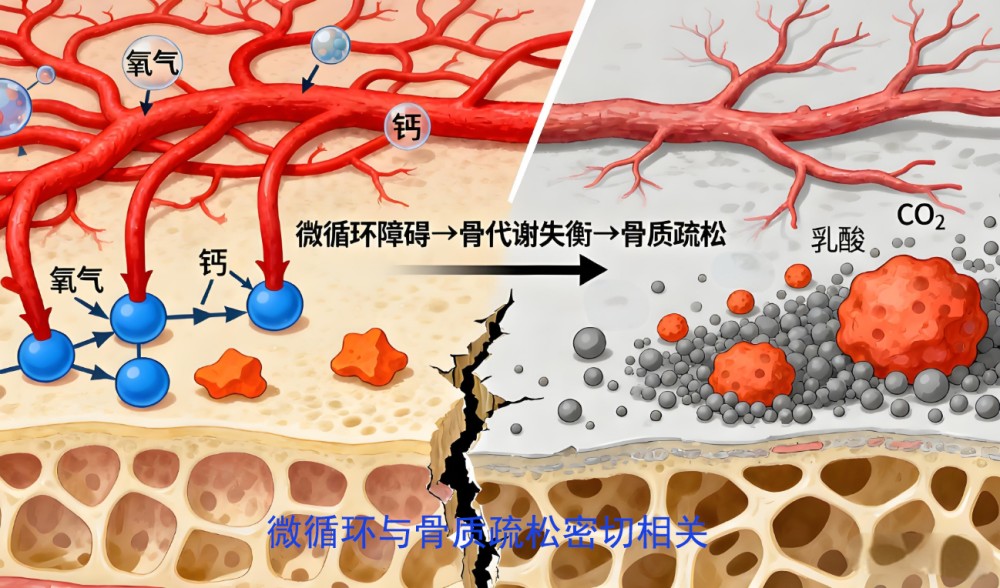 很多人可能不了解,微循環(huán)與骨質(zhì)疏松癥之間存在著極為密切的關(guān)聯(lián)。微循環(huán)作為人體循環(huán)系統(tǒng)的重要組成部分,主要通過影響骨組織的供血質(zhì)量、營(yíng)養(yǎng)物質(zhì)輸送效率以及代謝廢物排出速度深度參與骨代謝的調(diào)控過程。當(dāng)微循環(huán)出現(xiàn)障礙時(shí),骨組織無法獲得充足的氧氣和營(yíng)養(yǎng)供給,同時(shí)代謝廢物堆積,會(huì)直接導(dǎo)致骨細(xì)胞活性失衡——成骨細(xì)胞功能減弱,破骨細(xì)胞活性增強(qiáng),進(jìn)而加速骨量流失,最終誘發(fā)或加重骨質(zhì)疏松癥。這一機(jī)制也為治療骨質(zhì)疏松癥提供了全新的研究方向和治療思路。