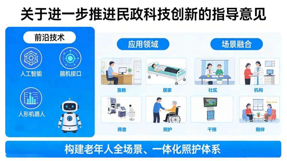 為破解行業(yè)痛點(diǎn),民政部日前印發(fā)《關(guān)于進(jìn)一步推進(jìn)民政科技創(chuàng)新的指導(dǎo)意見》,明確提出,要廣泛運(yùn)用人工智能、腦機(jī)接口、人形機(jī)器人等前沿技術(shù),聚焦失能失智預(yù)防、康復(fù)護(hù)理、安全監(jiān)測等關(guān)鍵領(lǐng)域,加快核心技術(shù)裝備研發(fā),推動(dòng)養(yǎng)老服務(wù)技術(shù)與居家、社區(qū)、機(jī)構(gòu)等場景深度融合,構(gòu)建老年人全場景、一體化照護(hù)體系。