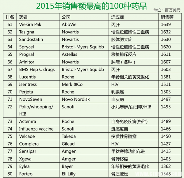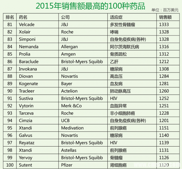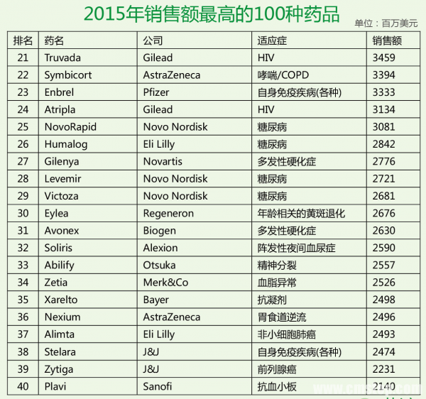 在過去的幾年內(nèi)推出其他 100 強藥物包括 Tecfidera(Biogen,多發(fā)性硬化癥),Xarelto(Bayer/J&J,抗凝劑),Eliquis(Bristol-Myers Squibb,抗凝劑),Stribild(Gilead,HIV)、Eylea(Regeneron/Bayer,AMD)、Invokana(J & J,糖尿?。┖蚗tandi (Astellas/Medivation,前列腺癌)也在表單。
