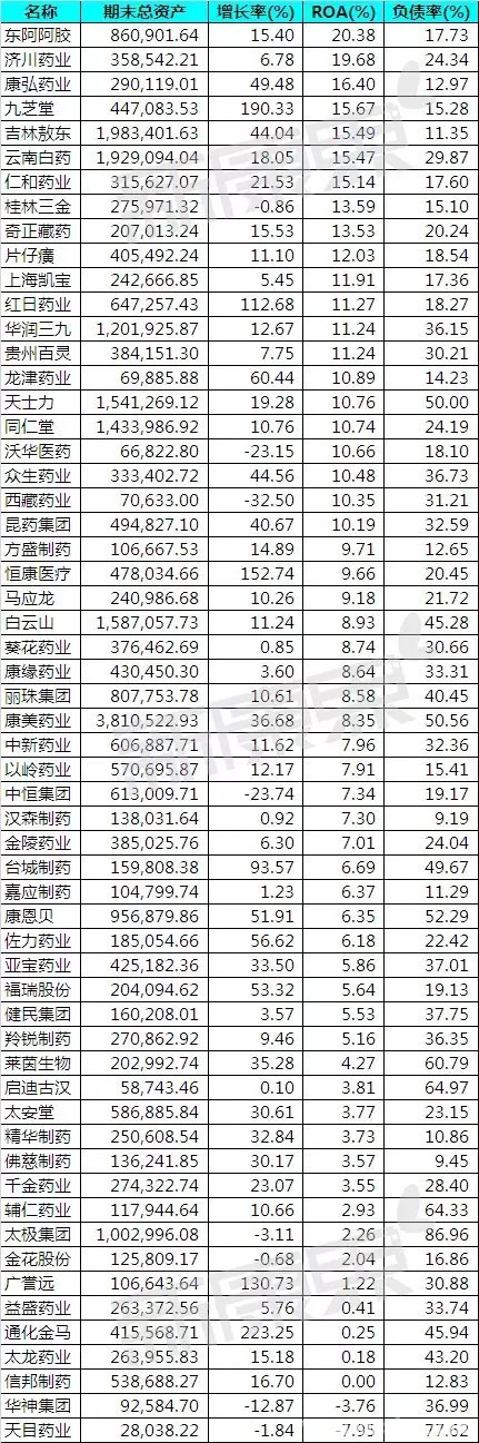 總資產(chǎn)增速TOP10企業(yè)中,增速最低的康弘藥業(yè)達到49.48%,最高的通化金馬則達到223.25%。被借殼的九芝堂和積極收購醫(yī)院的恒康醫(yī)療總資產(chǎn)增速分列二三位。然而,值得注意的是,總資產(chǎn)增速TOP10企業(yè)的ROA(總資產(chǎn)回報率)卻總體表現(xiàn)平平,其中,僅有九芝堂的ROA進入前十。